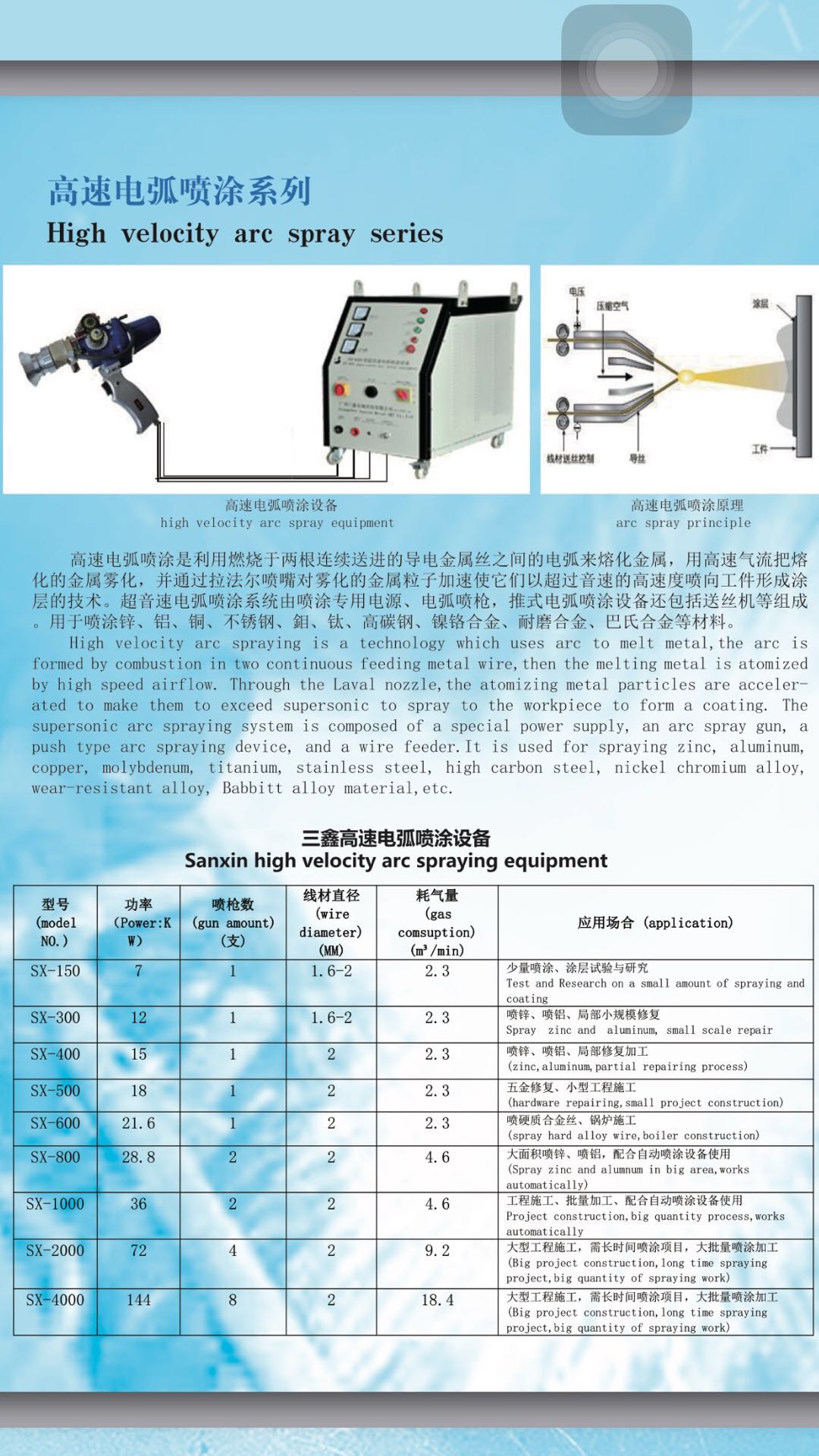 本公司生产的最新超音速电弧机主要由高速电弧喷枪、电弧喷涂电源组成。(内设送丝机构、控制系统和压缩空气系统。送丝分类有拉式机和推式机) 可根据用途选购拉式机或推式机。另需配套设备:空气压缩机、喷砂机、空气滤清器、放丝盘架。适合喷锌、铝、不锈钢、铜、镍基合金、铬基合金、巴氏合金、铅钼等各种线材功能涂层