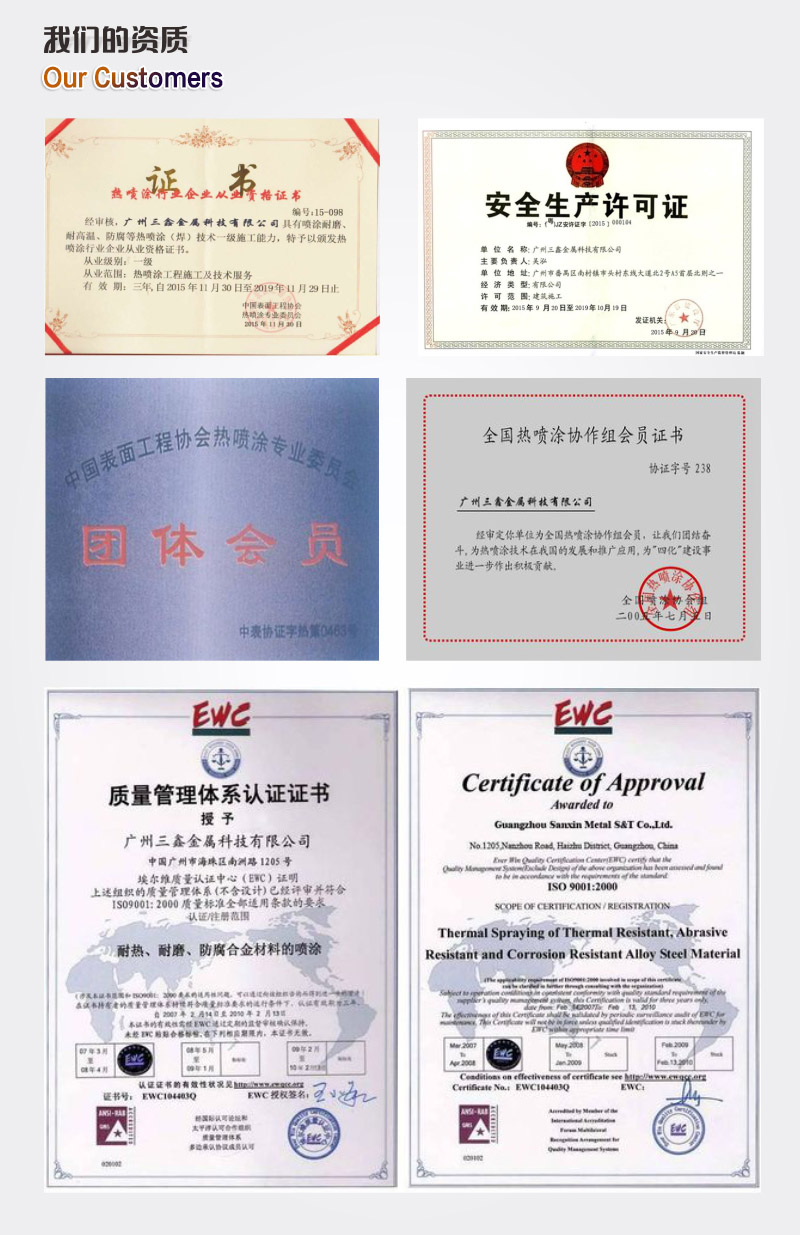 ●锅炉四管、制粉系统(风机叶轮及蜗壳)、滚筒、烘缸、轴类、模具等防磨防腐喷涂层。