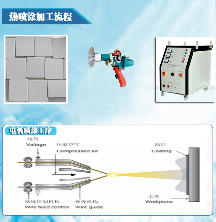 喷涂效率高、能源利用率好,每小时可喷金属丝材40Kg以上。适合于现场施工,可喷涂各种金属材料和金属陶瓷材料(实心丝材和粉芯丝材),如各种合金丝材、陶瓷、钼、铝、锌、紫铜、铜合金、不锈钢、巴氏合金等,广泛应用于钢结构、机械设备、曲轴、凸轮轴、起动机、发电机、轴类、模具、化工、印刷设备、造纸烘缸、电力、冶金等防磨防腐喷涂层。